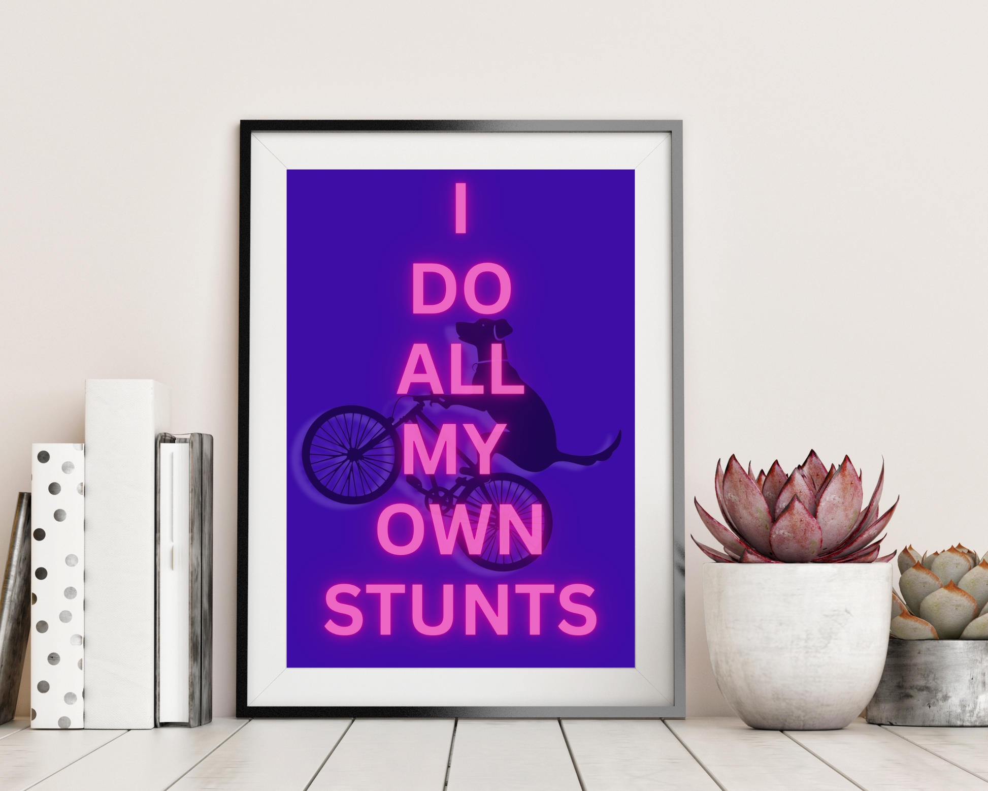 Add a playful touch to your space with our "I Do All My Own Stunts" neon art print, featuring an adventurous dog riding a bike.