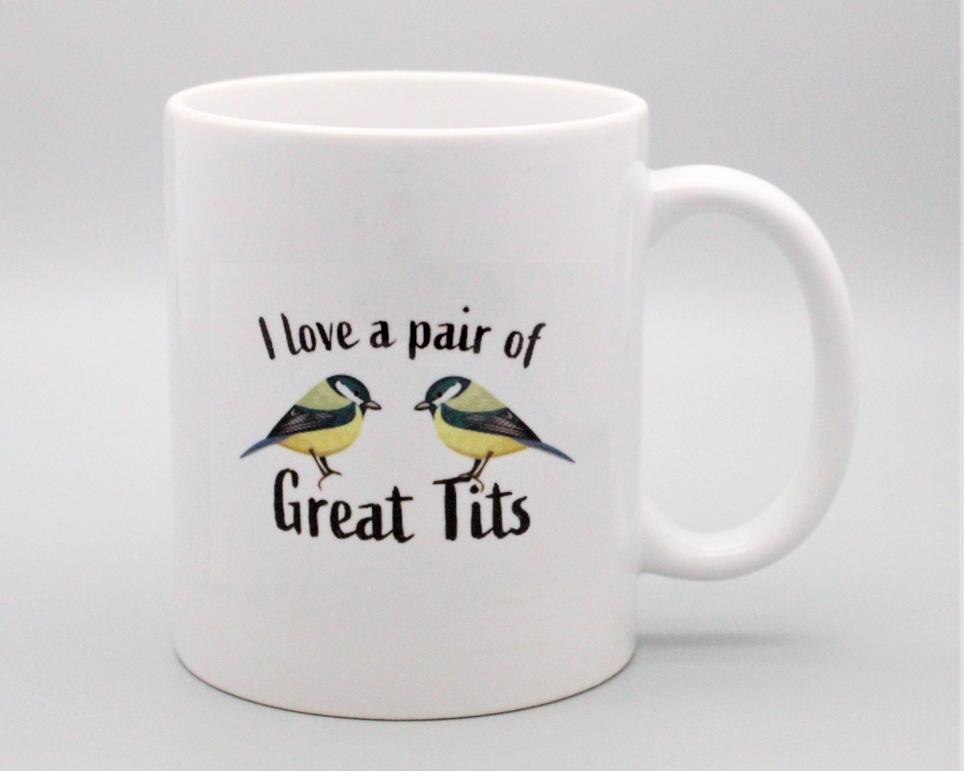 Indulge in harmless fun and a playful spin on words with our "I Love A Pair Of Great Tits" mug. Featuring a humorous pun and cheeky double meaning, this mug is perfect for bird enthusiasts and those who appreciate a good laugh. Makes a great gift for any occasion........Ok, it's not really for bird watchers!!