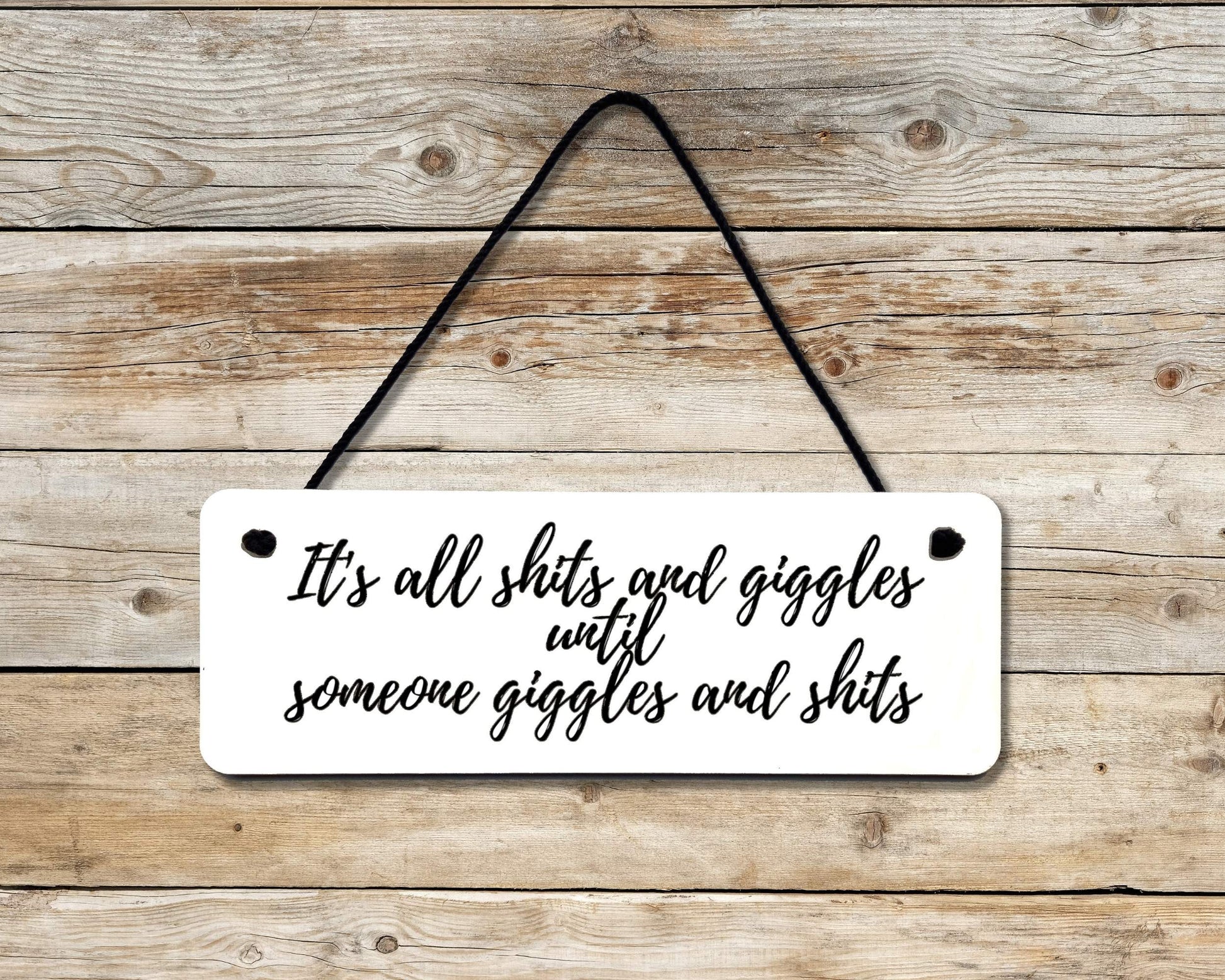 Add some fun to your home with the Shits & Giggles Wall Sign. Perfect for those nights with friends when someone always takes it a bit too far!! This sign will add some fun to any gathering. Get yours now!